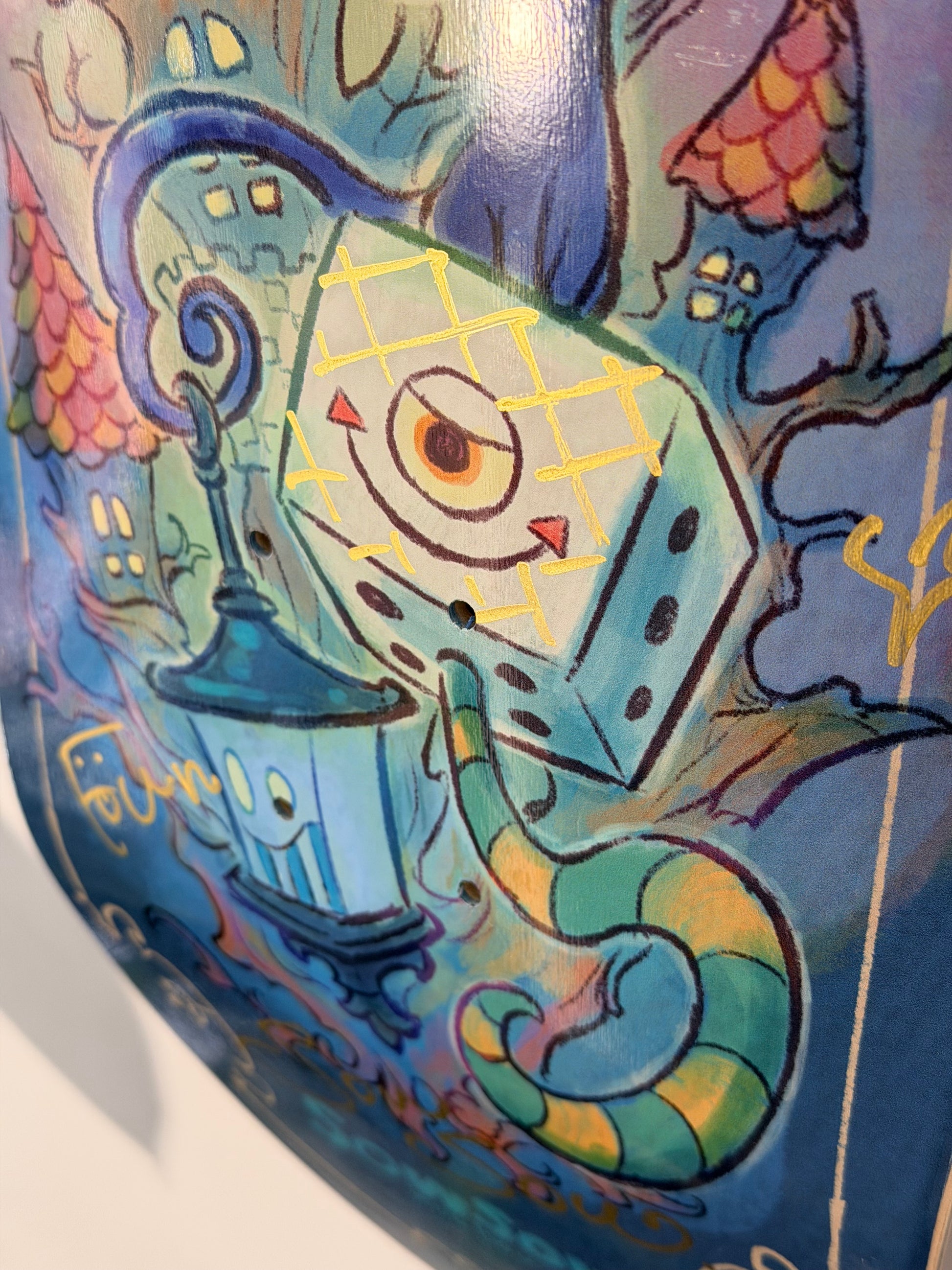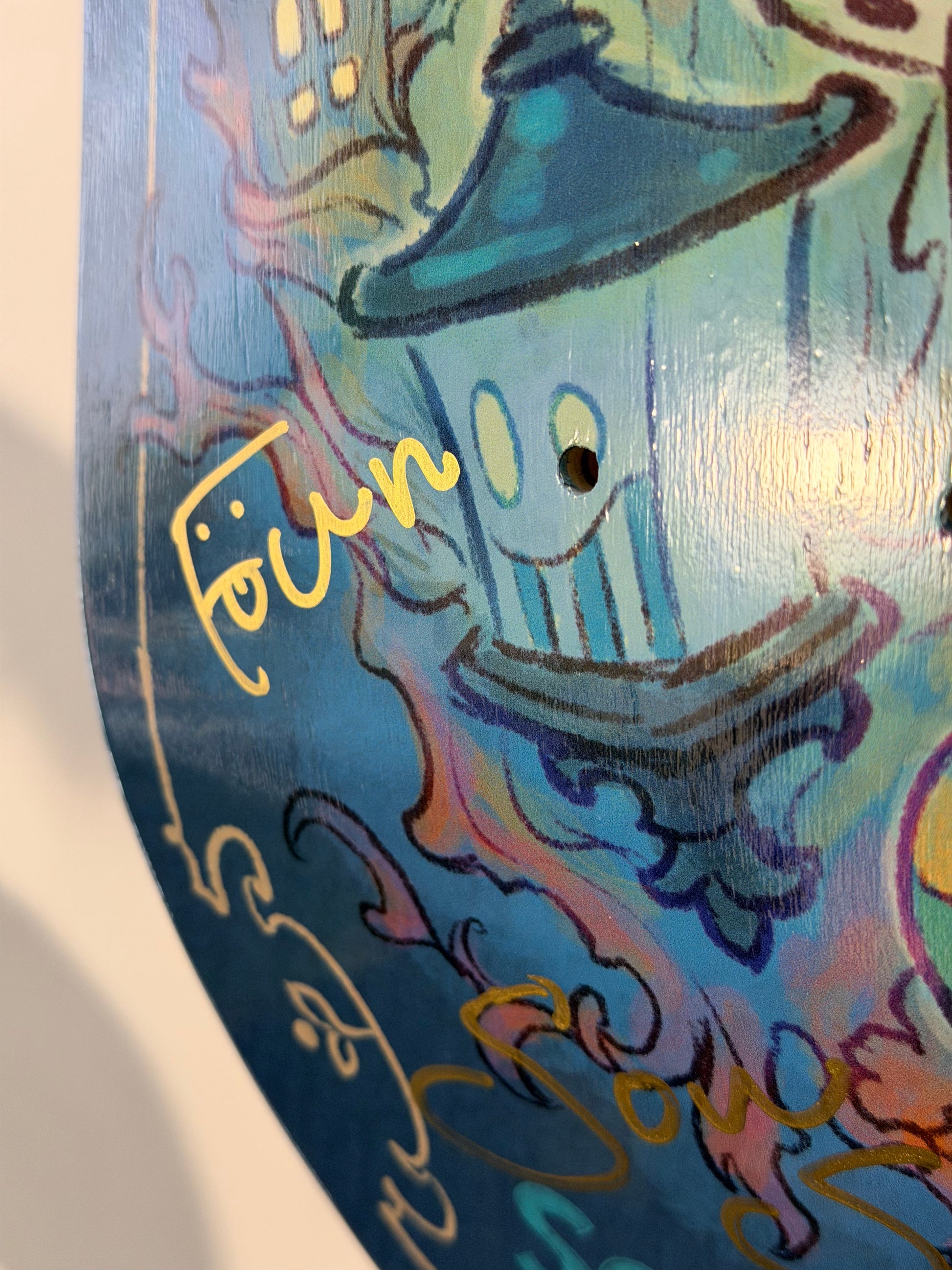 このスケートボードの底部にはアーティストの手書きサインが金色で入っています。